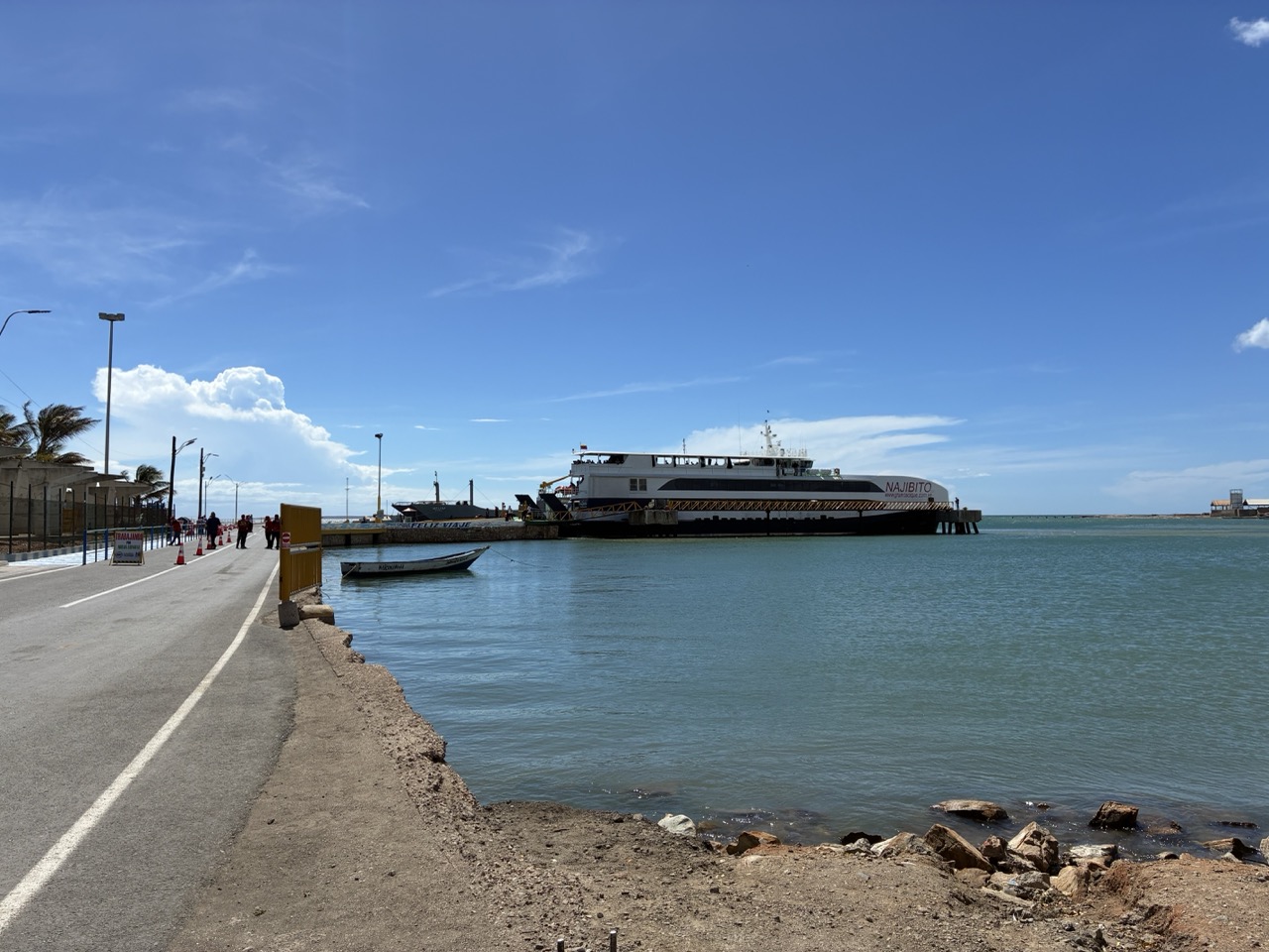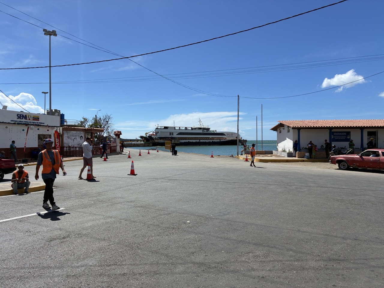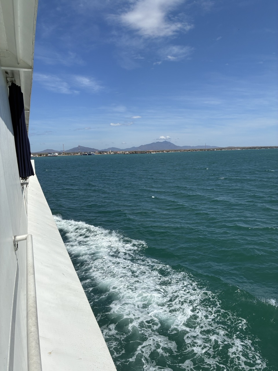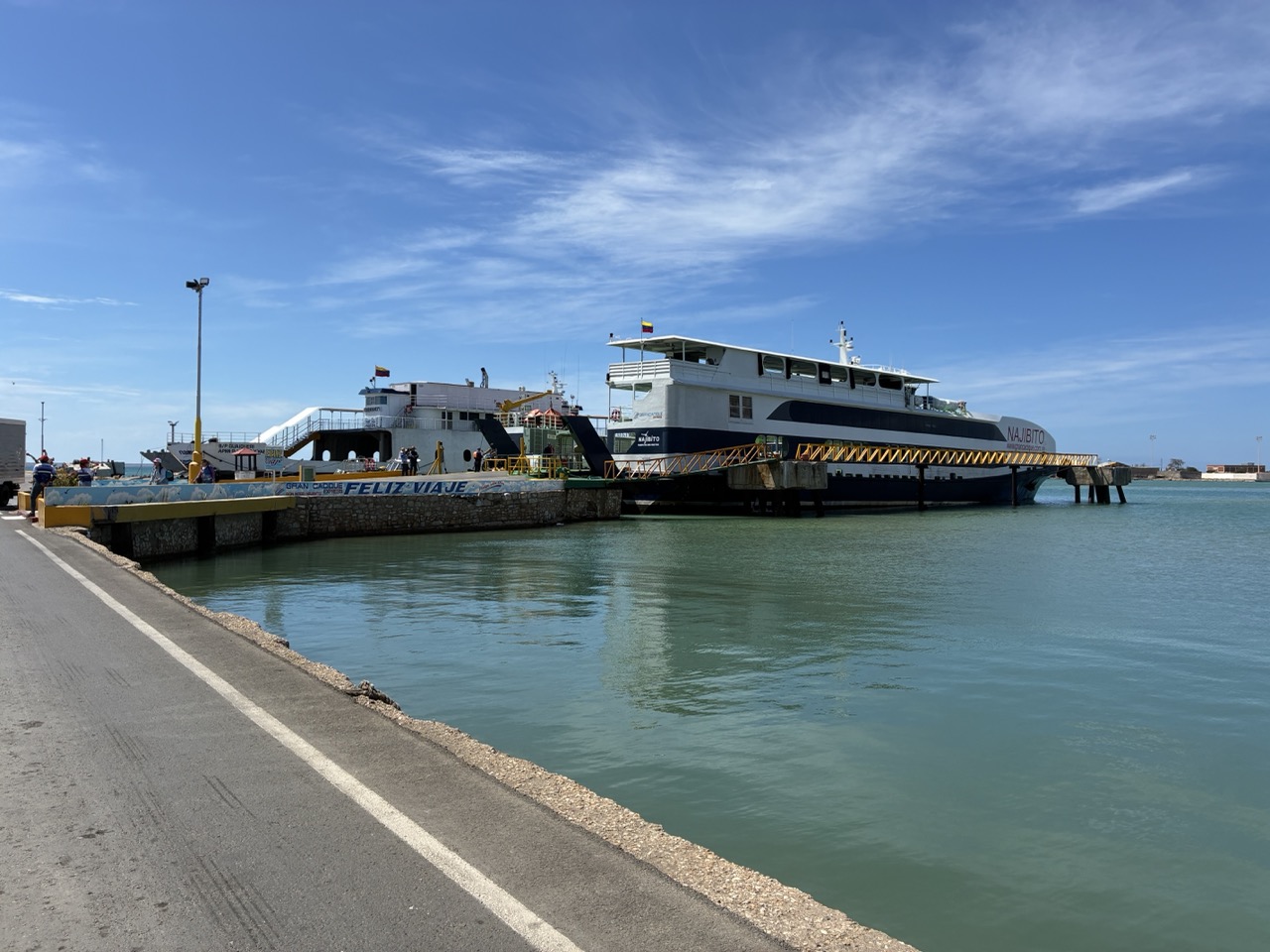 The ferry was very nice. I paid the base rate for the open covered seat area upstairs. I could have paid a bit more for aircon and fancier seat on the lower deck. My row of seats upstairs was perfect for me. The ferry left on time after momentarily putting the ramp down again to throw off two stowaway street dogs that had snuck on. The ride was nice and took about 3 hours. We passed a couple of bits of land which were a mix of mainland and islands. All part of Venezuela. It reminded me of the Greek Islands. But also of my time working in the Caribbean, strangely enough.