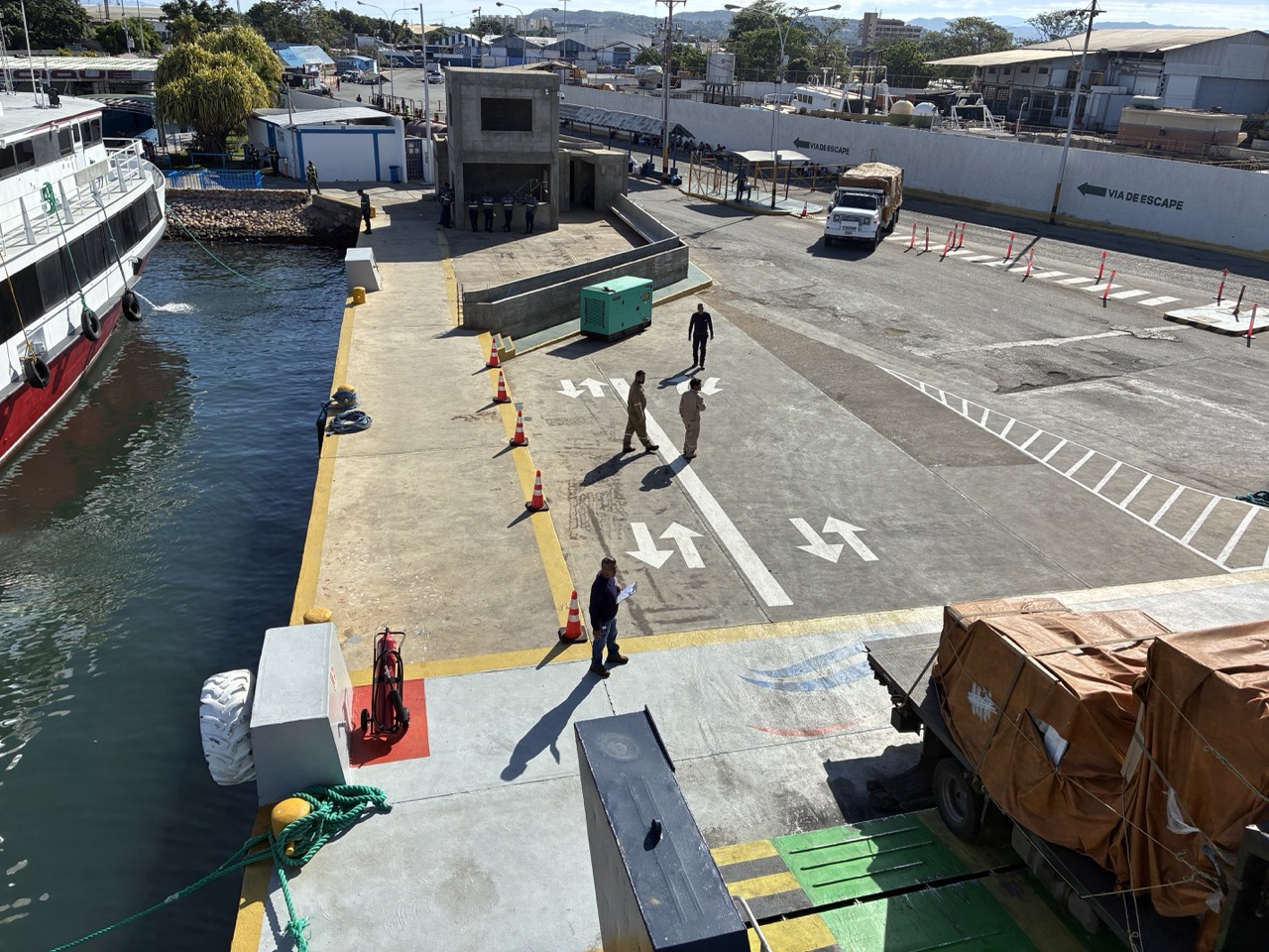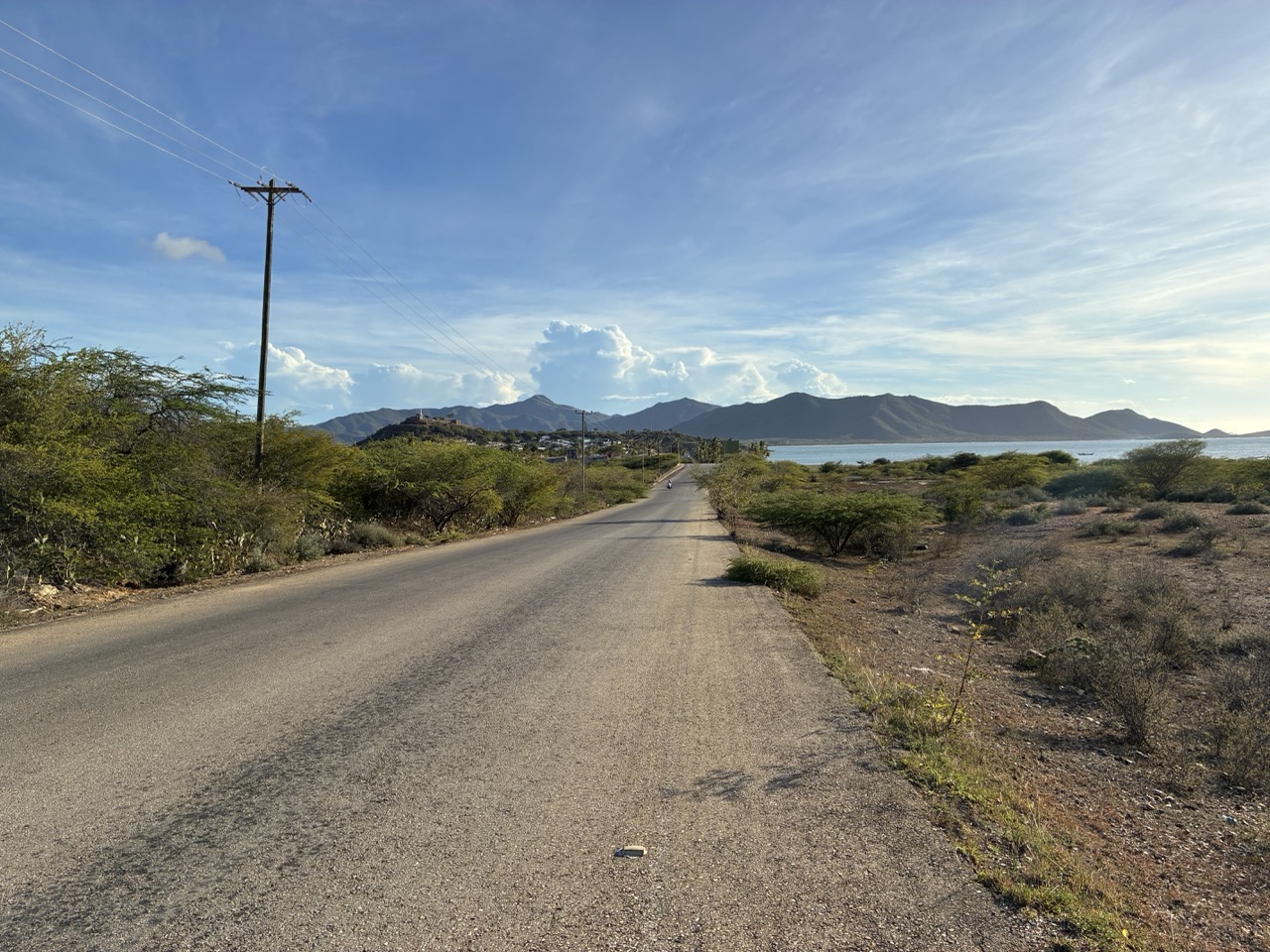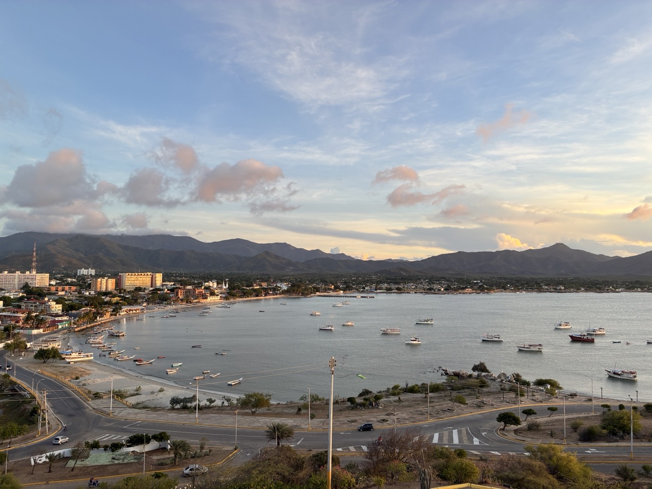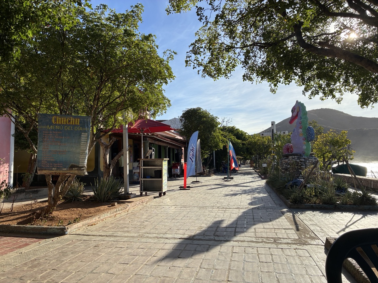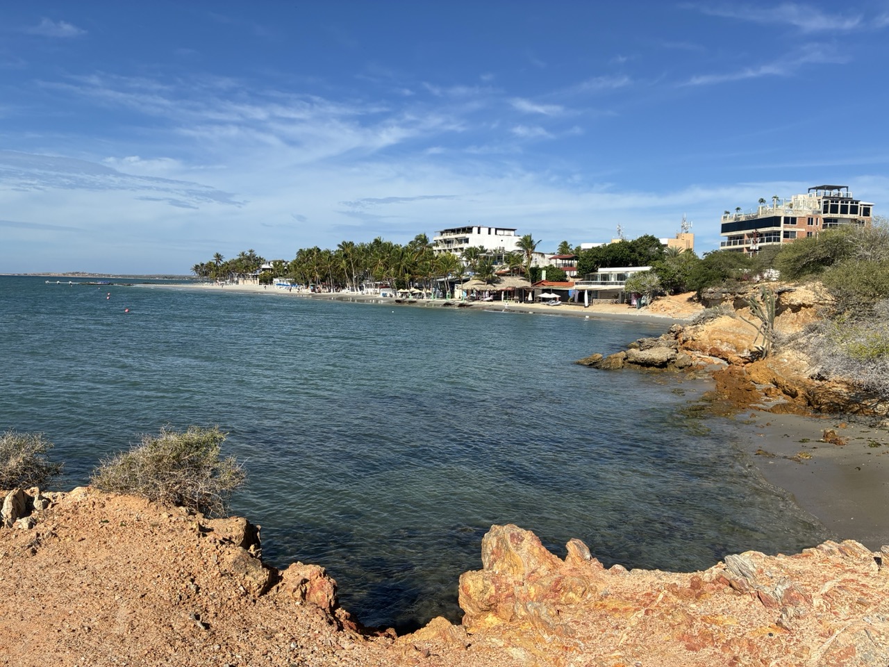 The ferry was very nice. I paid the base rate for the open covered seat area upstairs. I could have paid a bit more for aircon and fancier seat on the lower deck. My row of seats upstairs was perfect for me. The ferry left on time after momentarily putting the ramp down again to throw off two stowaway street dogs that had snuck on. The ride was nice and took about 3 hours. We passed a couple of bits of land which were a mix of mainland and islands. All part of Venezuela. It reminded me of the Greek Islands. But also of my time working in the Caribbean, strangely enough.