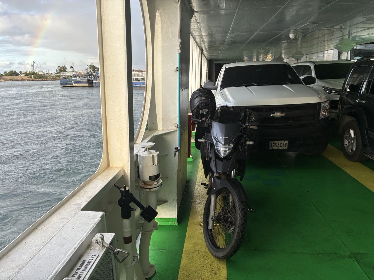 I rode to the terminal and was met by a couple of guys who wanted to be my personal assistant and walk me across the street to the ferry office and then walk you back to the immigration office. One of them had seen me arriving and chased my bike to the port. The other was in the carpark when I arrived. They both claimed me as theirs, which was a bit weird. I didn’t need either of them but while they were arguing who got me first, I was in and out of the ticket office and gone. I’m sure they just do it hoping for a tip. The ferry left on time again. Same trip as before but in reverse except that this time I had to strap my bike down so that it wouldn’t fall over. I carry a couple of light straps just for such an occasion. I arrived back in Cumana just before dark and rode straight off the ferry and back to my original hotel. My Caribbean Island holiday was over. Next day I was heading further west to the town of Puerto la Cruz.